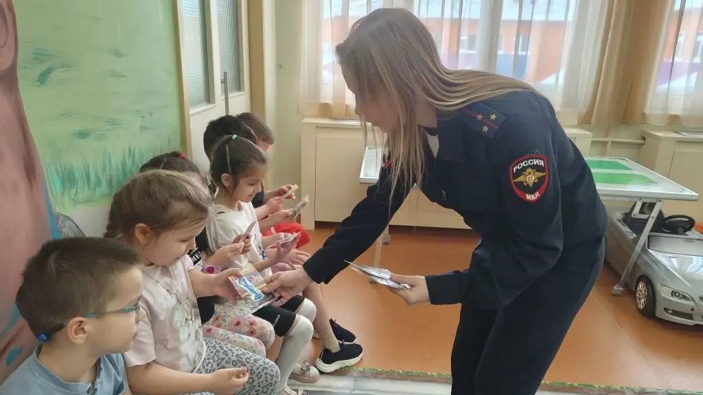 В ходе занятия полицейские объяснили малышам, как важно быть внимательными на улицах, рассказывая о правилах безопасного перехода дороги.