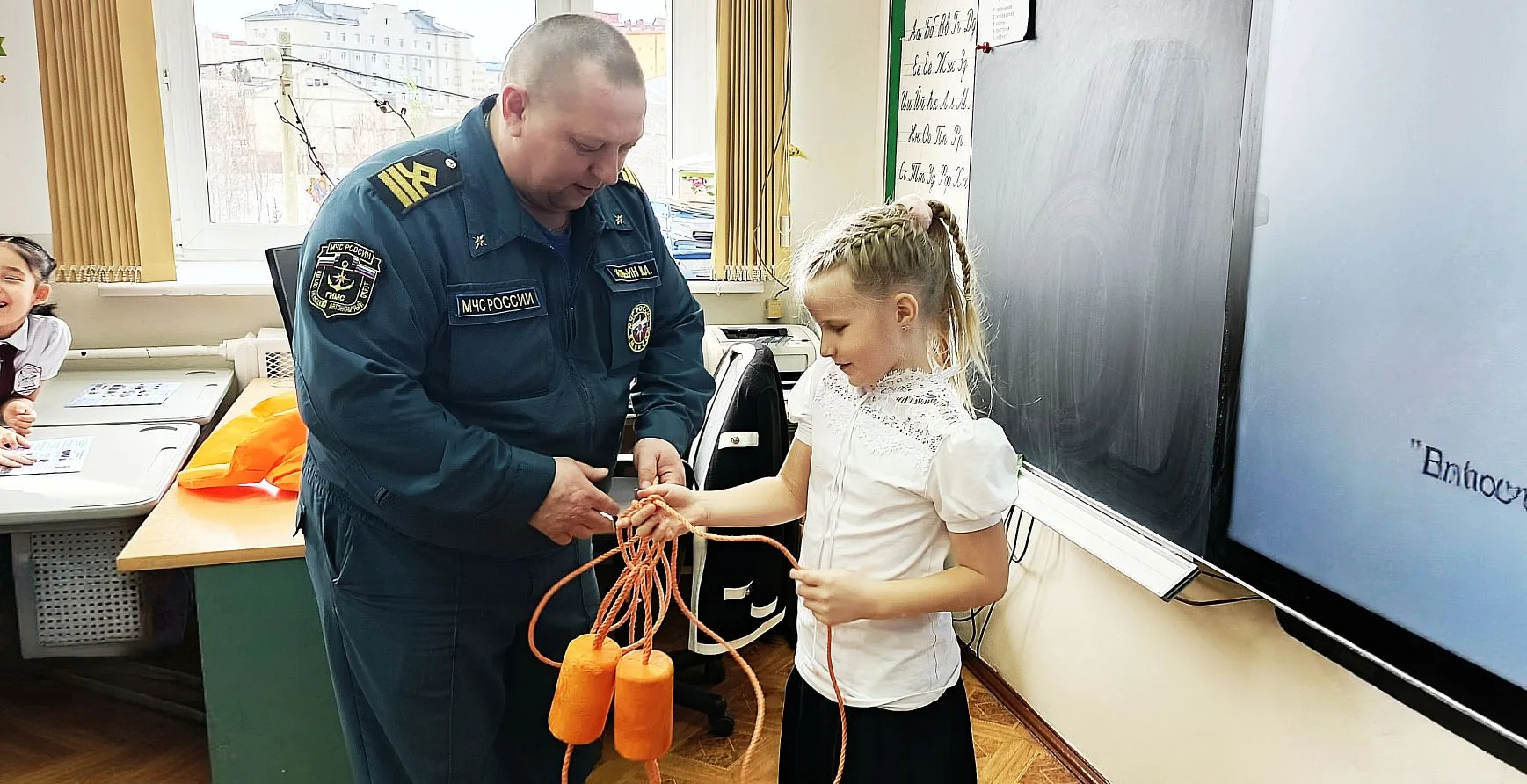 Дети не только слушали, но и активно участвовали в уроке: гости организовали интерактивную игру, в ходе которой ребята учились правильно подавать «спасательную верёвку». Также специалисты продемонстрировали средства спасения и объяснили, для чего они предназначены.