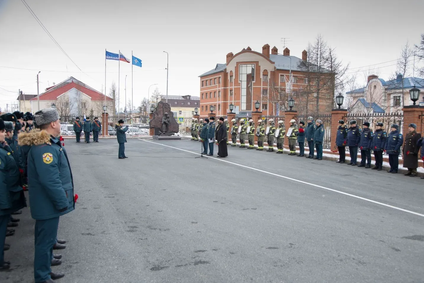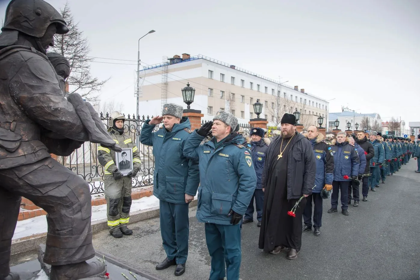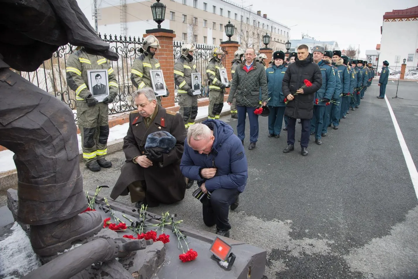 В завершении церемонии под звуки метронома личный состав почтил память ямальских коллег и возложили цветы к монументу «Героям мирного времени-пожарным Ямала».