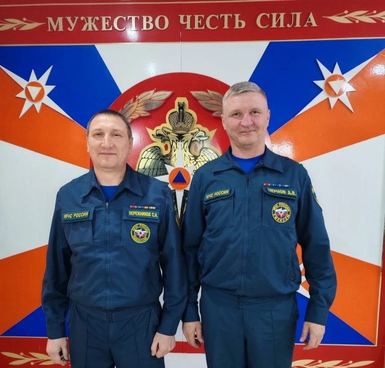 На фотографии командир отделения отдельного поста 1 пожарно-спасательной части Чернов Дмитрий Владимирович и пожарный отдельного поста 1 пожарно-спасательной части Вережников Сергей Николаевич