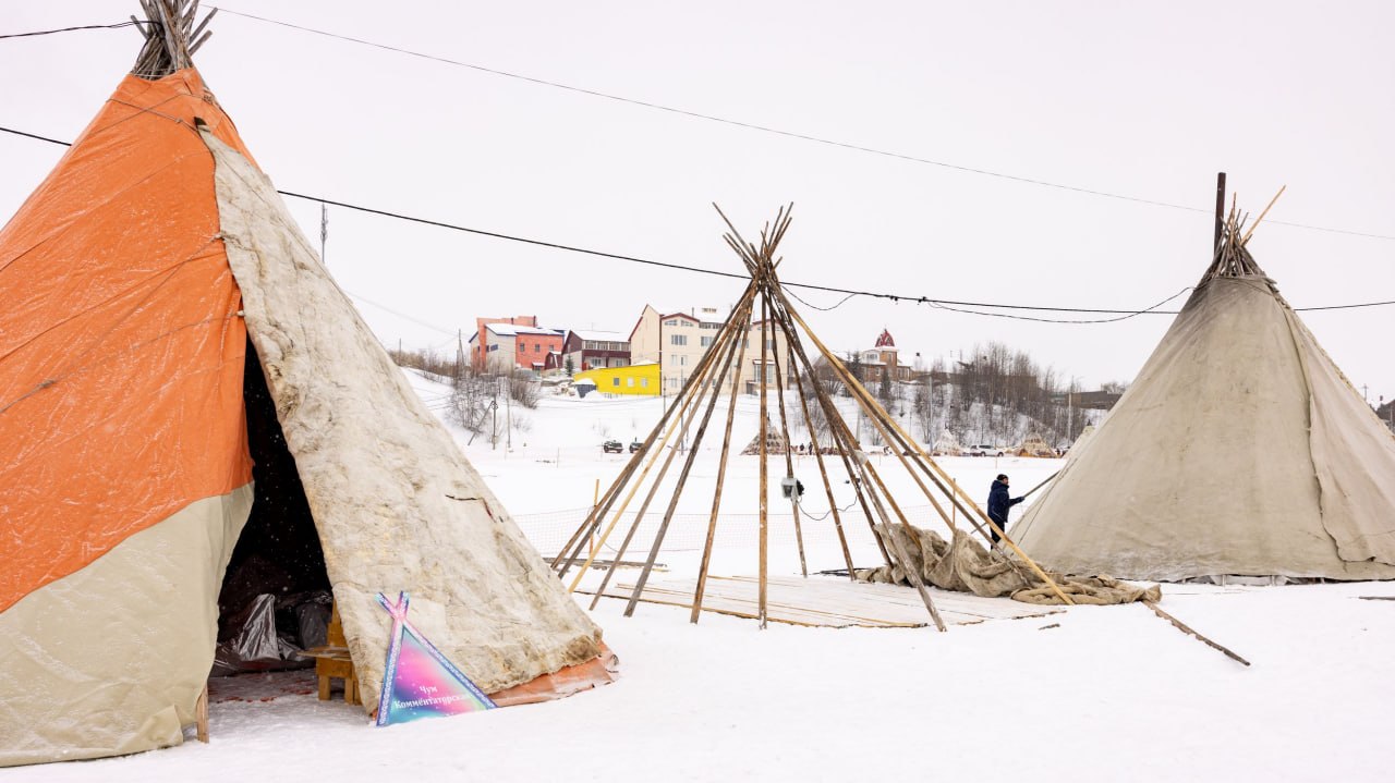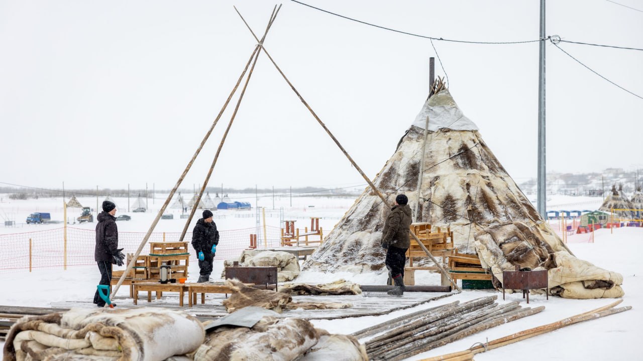 Работа кипит: умельцы ставят чумы, готовят трассу и проверяют упряжки.