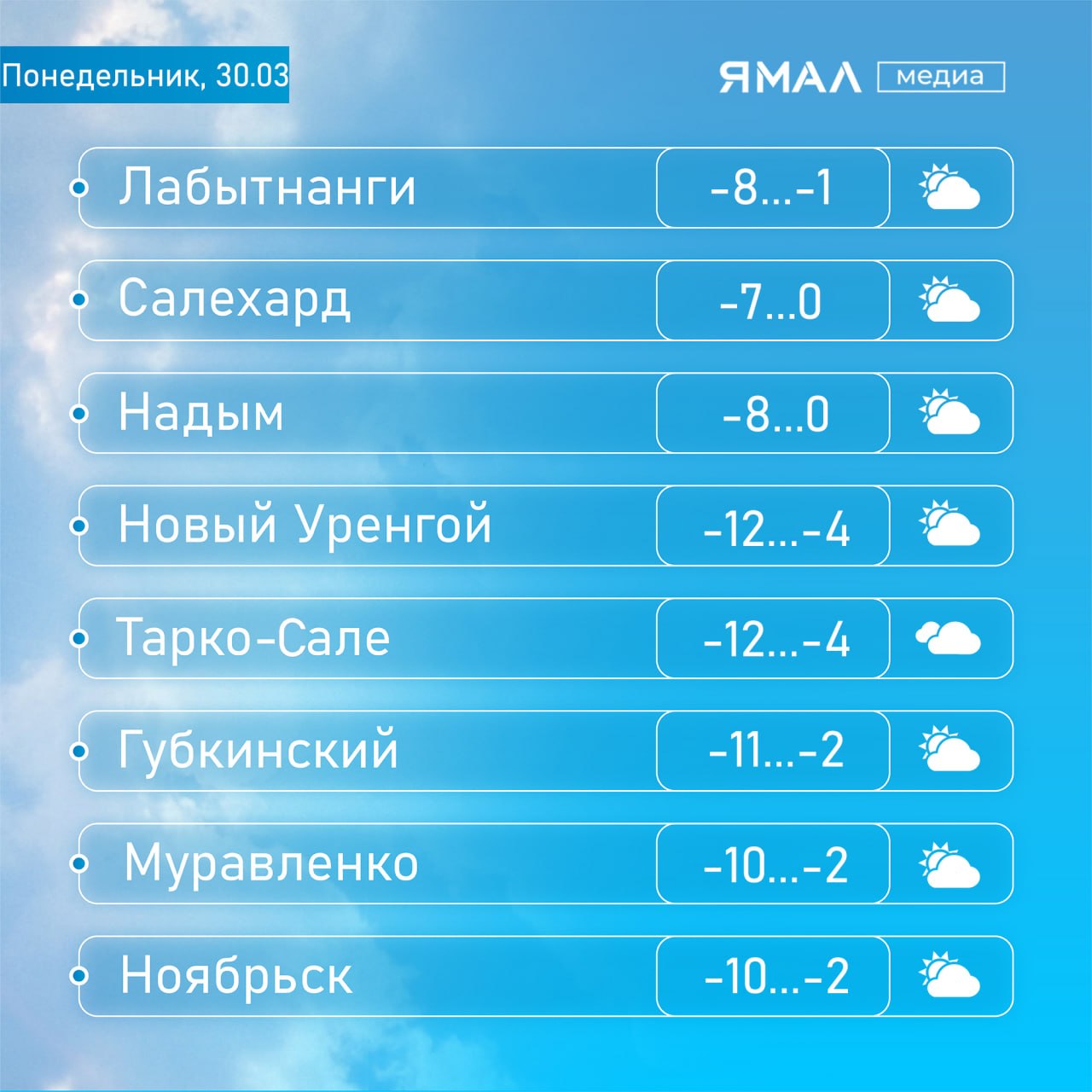 Понедельник на Ямале будет спокойным и серо-ясным: облака, чуть солнца и уверенный минус — без метелей, но с намёком, что зима всё ещё держит пульт.