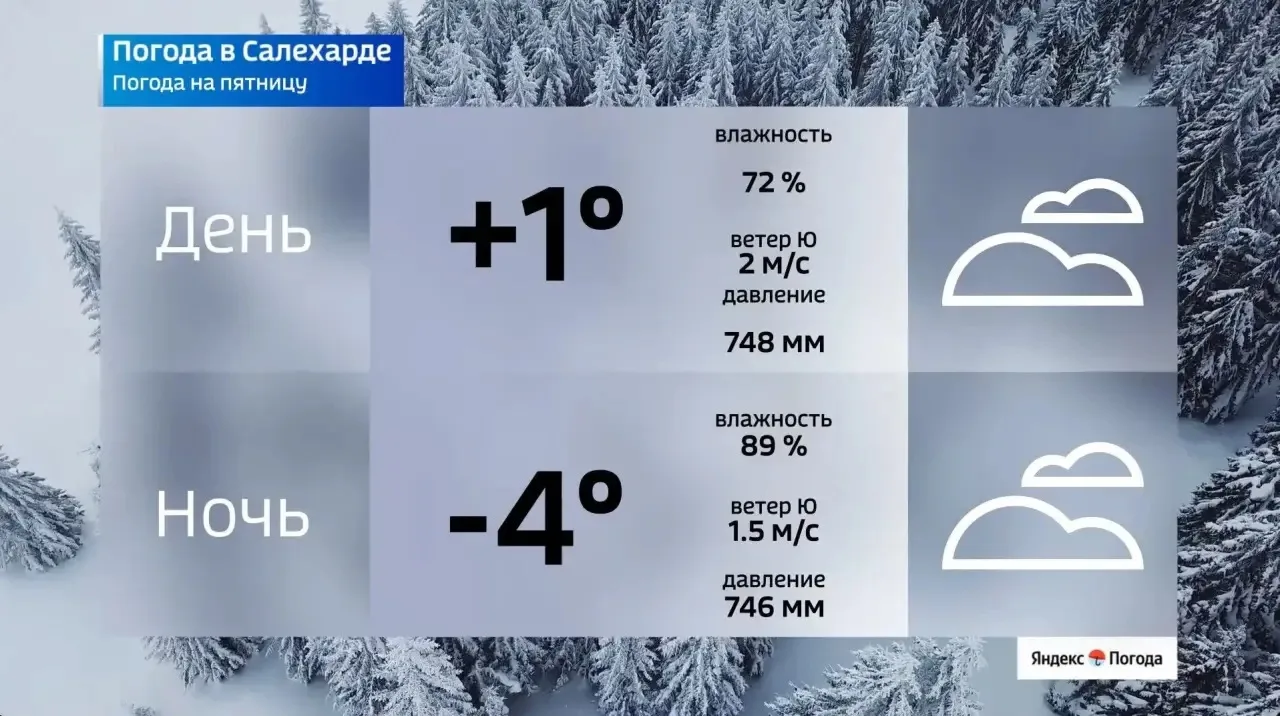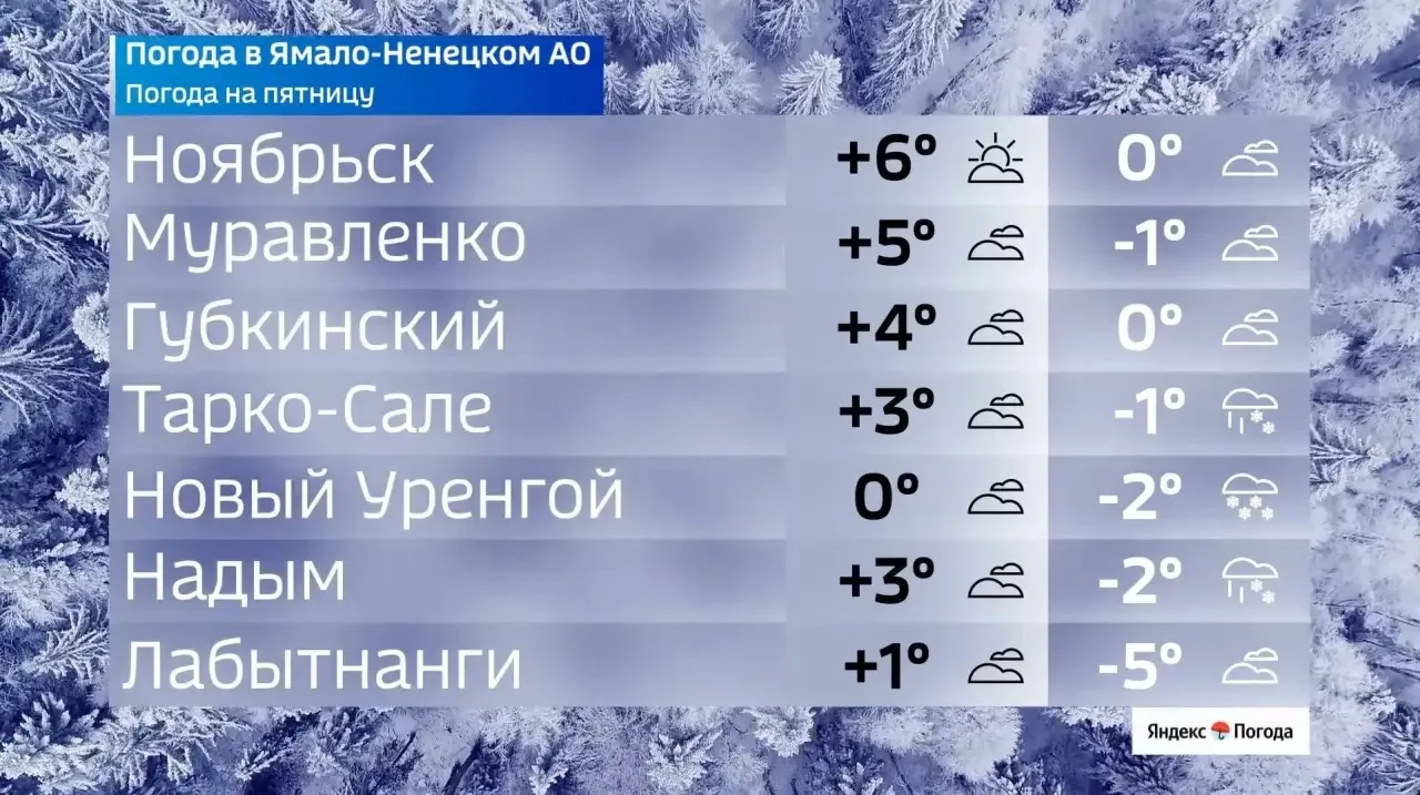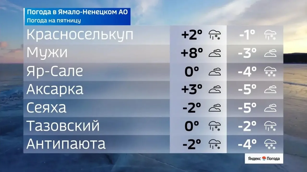 По данным Яндекс Погоды, 24 апреля в регионе температурный фон остаётся контрастным. Днём теплее всего в селе Мужи до +8°C, а ночью холоднее всего в Лабытнанги, Аксарке и Сеяхе до -5°C.