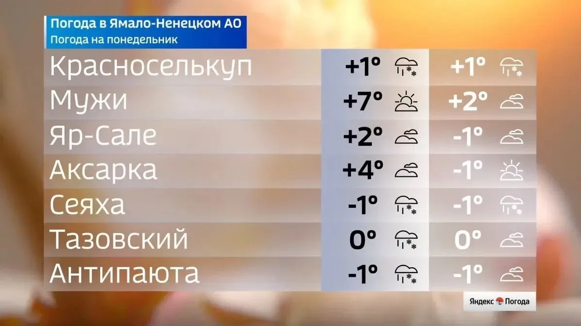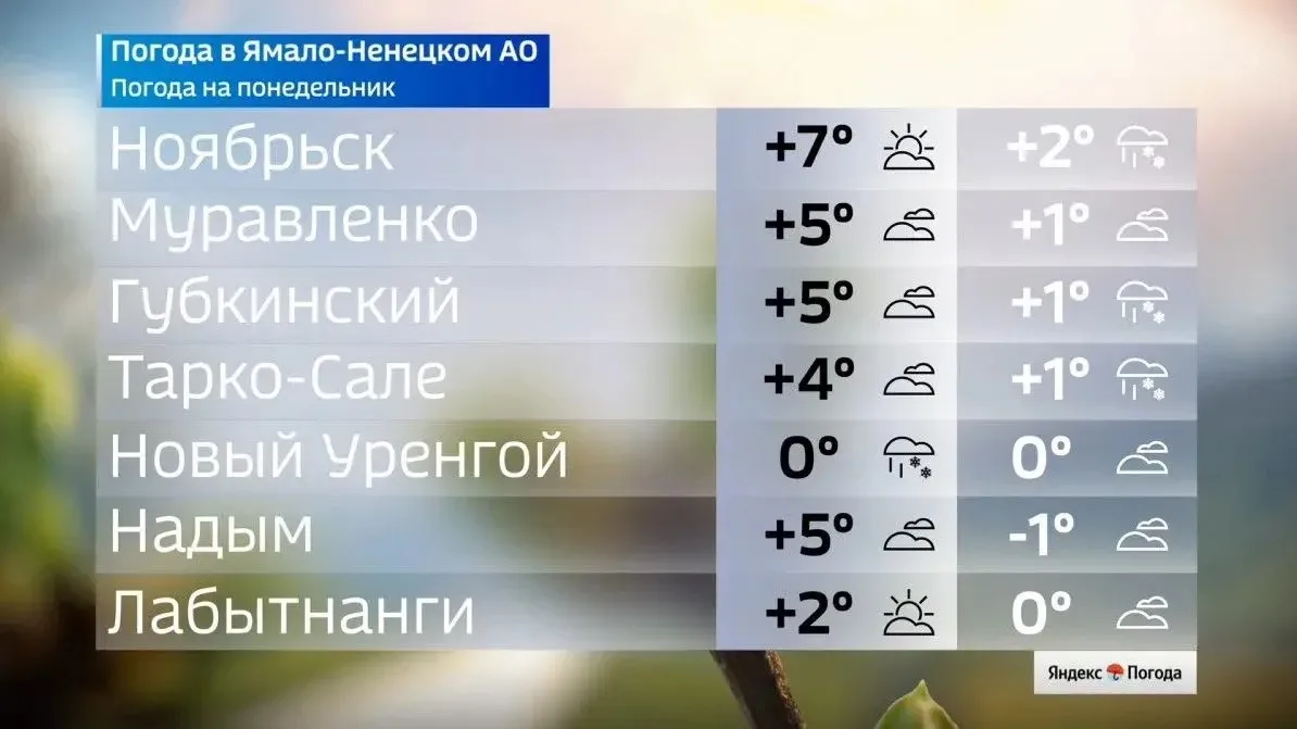 Теплее всего будет в Ноябрьске и Мужах — там воздух прогреется до +7 градусов. В Надыме, Губкинском и Муравленко ожидается до +5, а в Салехарде столбики термометров поднимутся до +3 градусов. На севере региона, в Сеяхе и Антипаюте, погода сохранится около нуля.