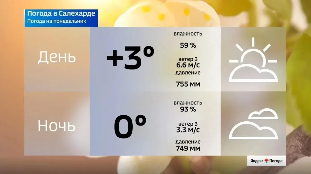 В окружной столице днем ожидается западный ветер с порывами до 6,6 м/с. К ночи температура в Салехарде опустится до 0 градусов, а влажность воздуха вырастет до 93%.