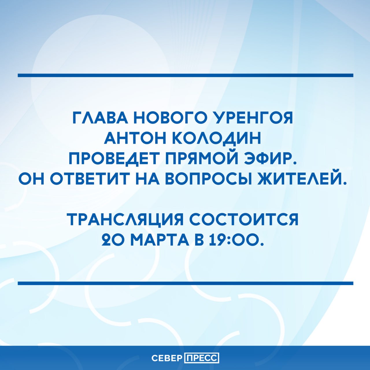 Глава Нового Уренгоя проведет прямой эфир. 20 марта Антон Колодин ответит на вопросы жителей (их можно оставить под постом в телгерам-канале главы).