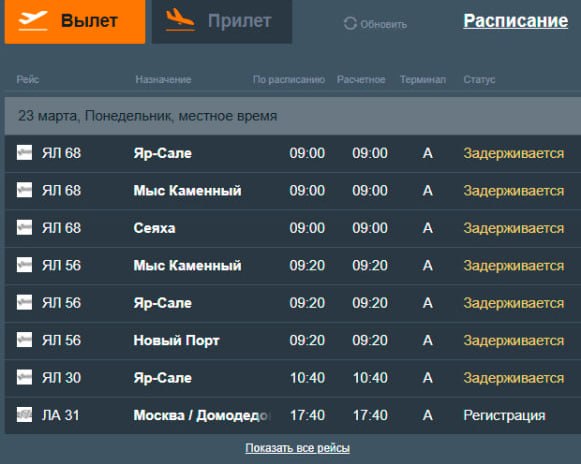 Похоже, Салехард сегодня действительно не отпускает. Рейсы в Яр-Сале, Мыс Каменный, Сеяху и Новый Порт перенесены на 24 марта.