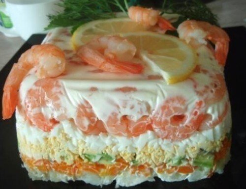 На дно формы выложить очищенные креветки и покрыть их смесью из желатина и майонеза – это будет первый слой.