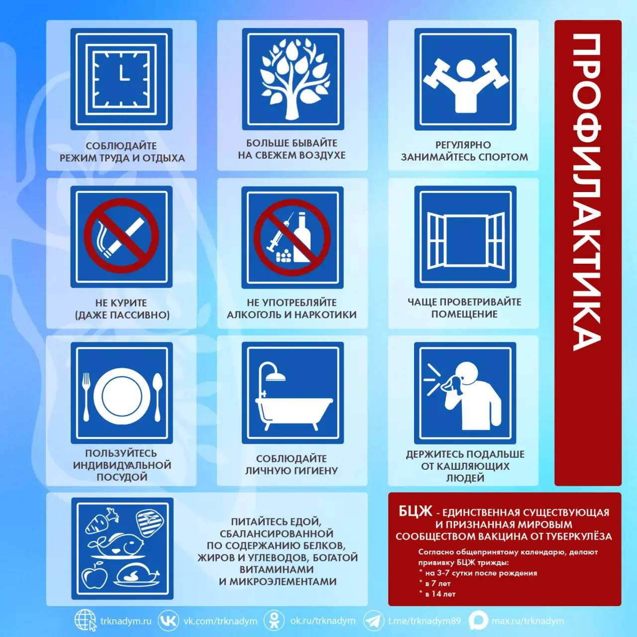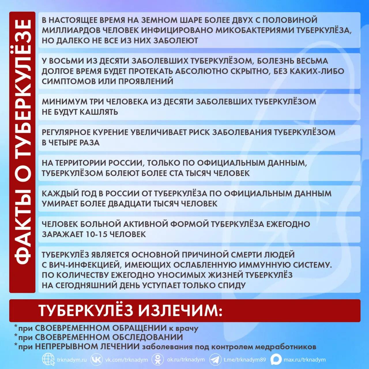 В карточках представили распространённые факты и способы профилактики туберкулёза Сохраните их и поделитесь с другими. Помните, своевременная диагностика может помочь избежать осложнений заболевания!