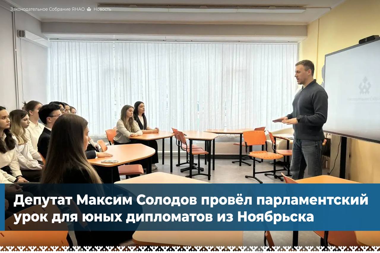 Максим Солодов рассказал школьникам о закулисье законотворчества и поделился собственным опытом работы с обращениями жителей. Депутат отметил, что его особенно порадовала заинтересованность юных дипломатов – неравнодушие и желание влиять на свой город звучали в каждом вопросе.