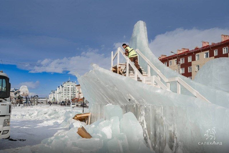У «Геолога» работает техника — ледовый городок разбирают. Зима уступает, но впечатления от праздников никуда не делись. Впереди — весна и новая сказка. Фото: телеграм-канал «Администрация Салехарда»