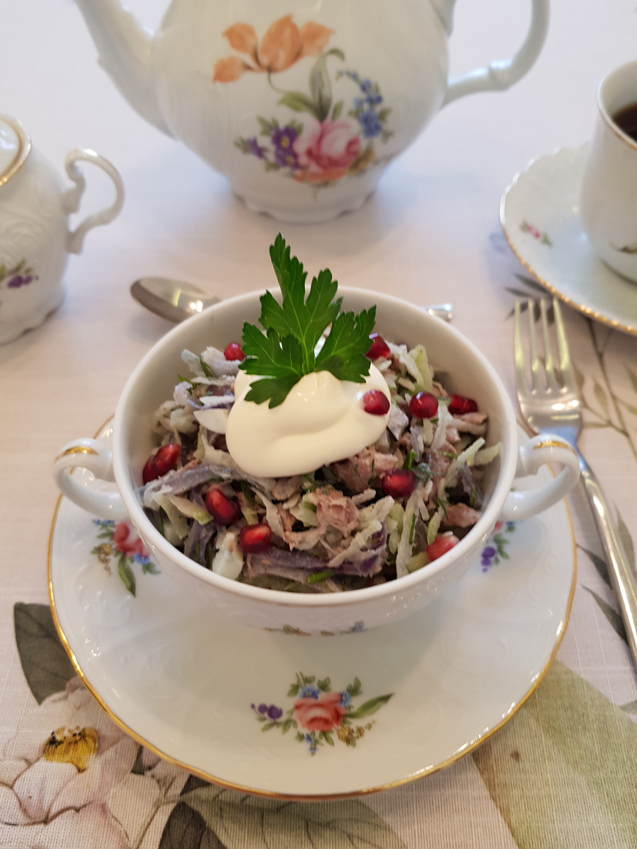 Перед подачей порционировать салат по тарелкам, добавить немного майонеза, красиво украсить зернами граната и зеленью петрушки. Готово — можно наслаждаться!