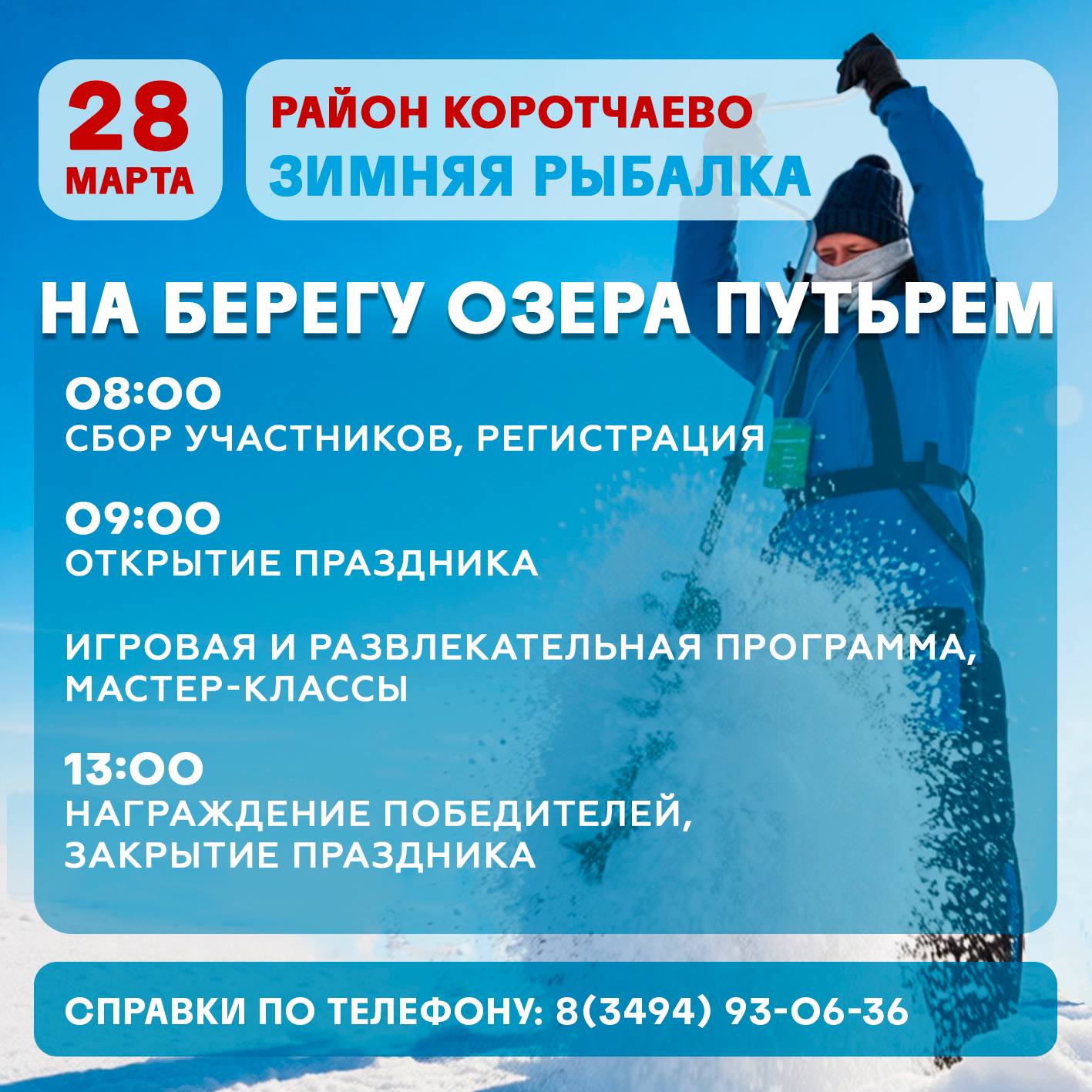 Рыбацкие забавы и праздничное настроение обеспечены всем участникам и гостям. В обязательной программе также бой подушками, бурение лунок и распил бревна на скорость, метание валенка на дальность. Подробности — на карточке выше