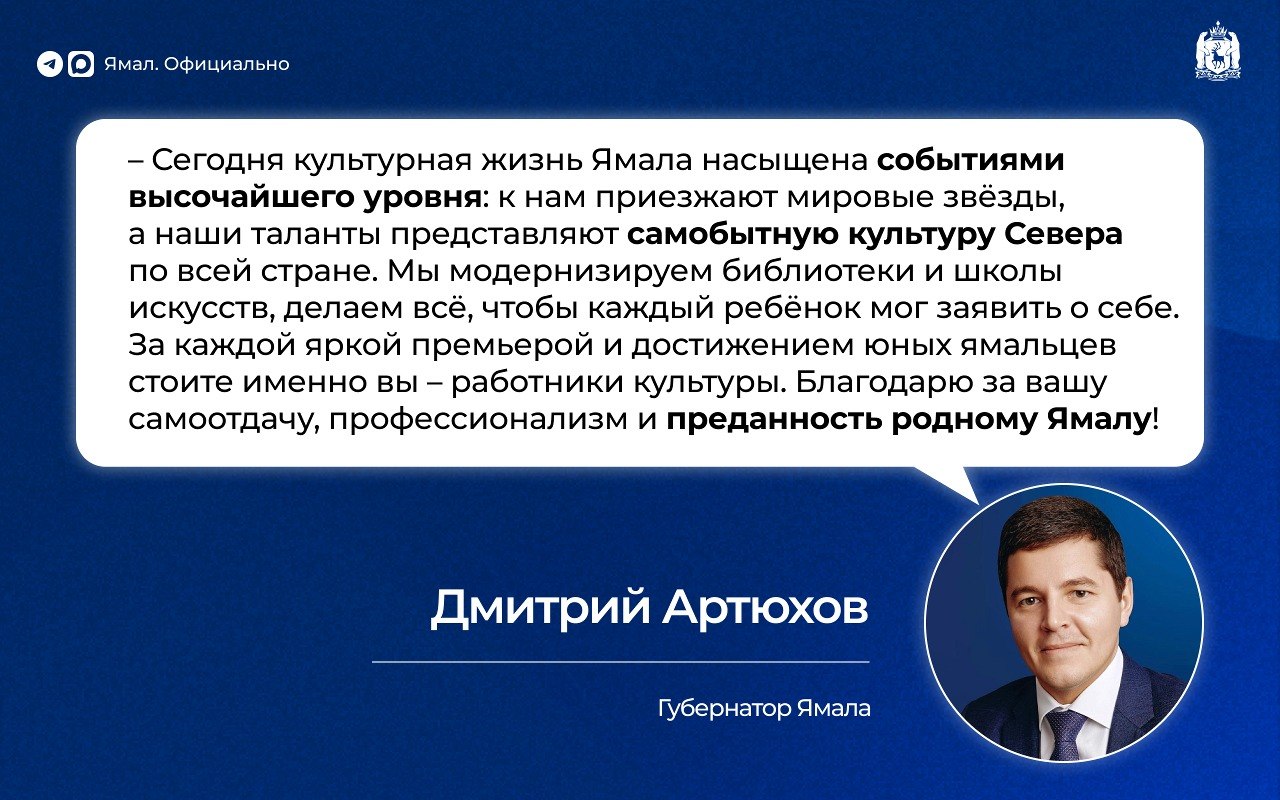 На Ямале в сфере культуры работают около четырёх тысяч человек. Губернатор Дмитрий Артюхов пожелал всем им благополучия, неиссякаемого вдохновения, реализации самых амбициозных проектов.