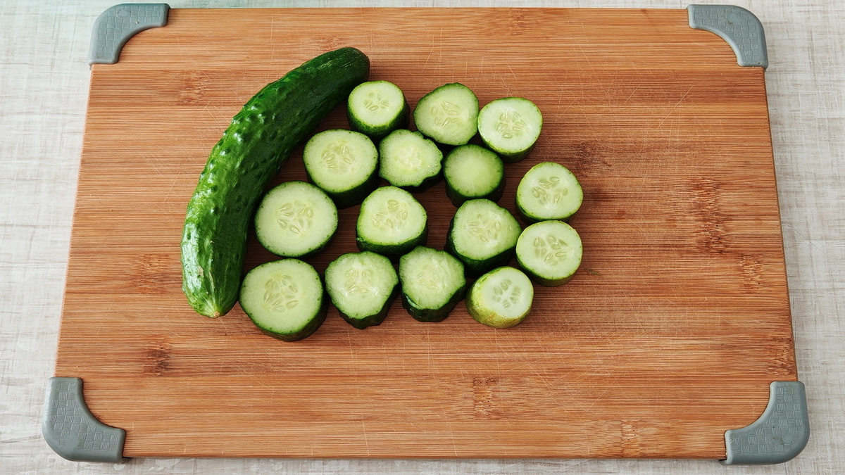 Для начала, огурцы стоит замочить в прохладной воде на два часа. Это поможет укрепить их хрусткость. Затем, овощи нарезаются на равные кусочки.