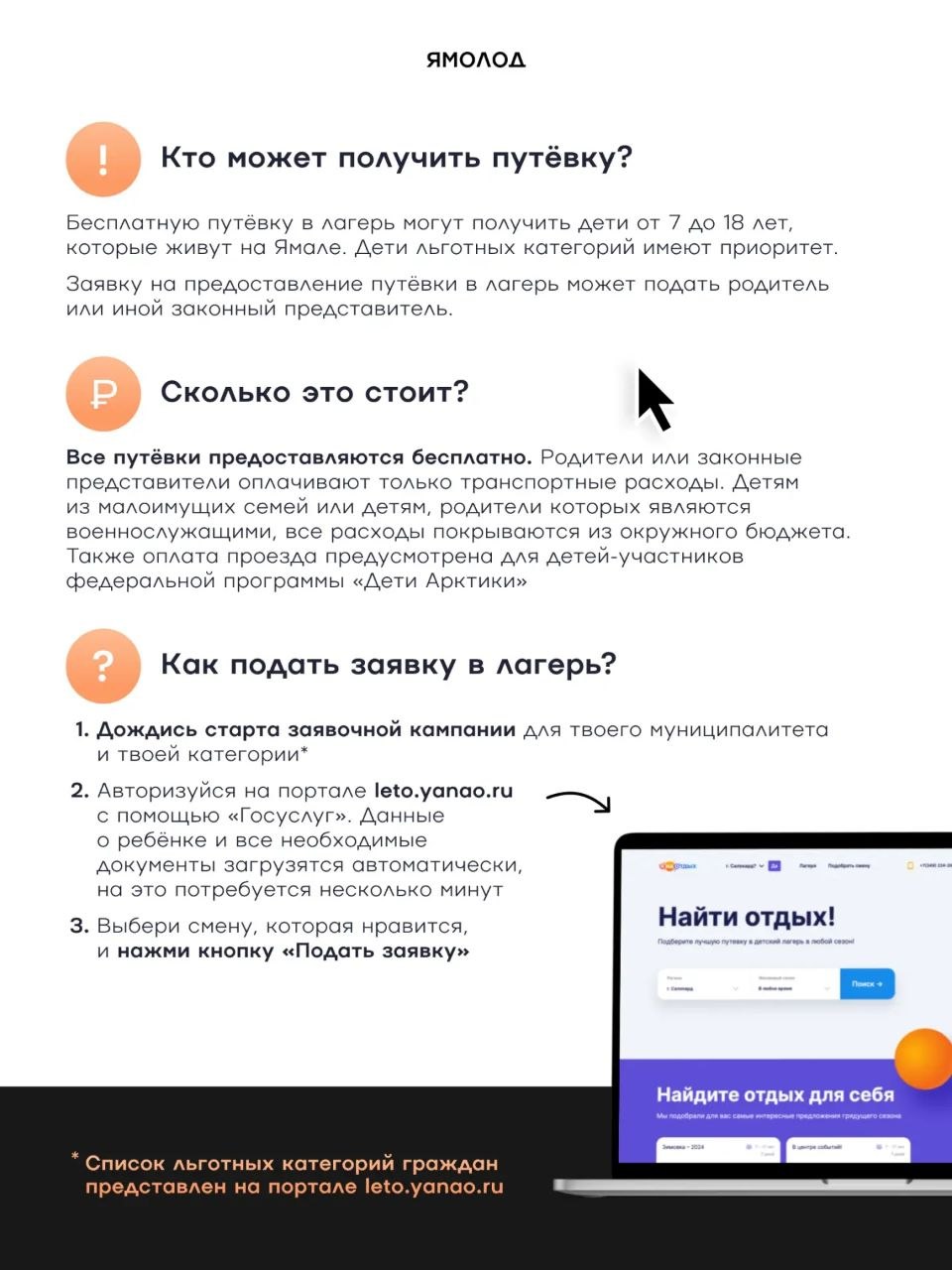 Больше информации – в карточках. Все смены, лагеря и детали отдыха на портале leto.yanao.ru.