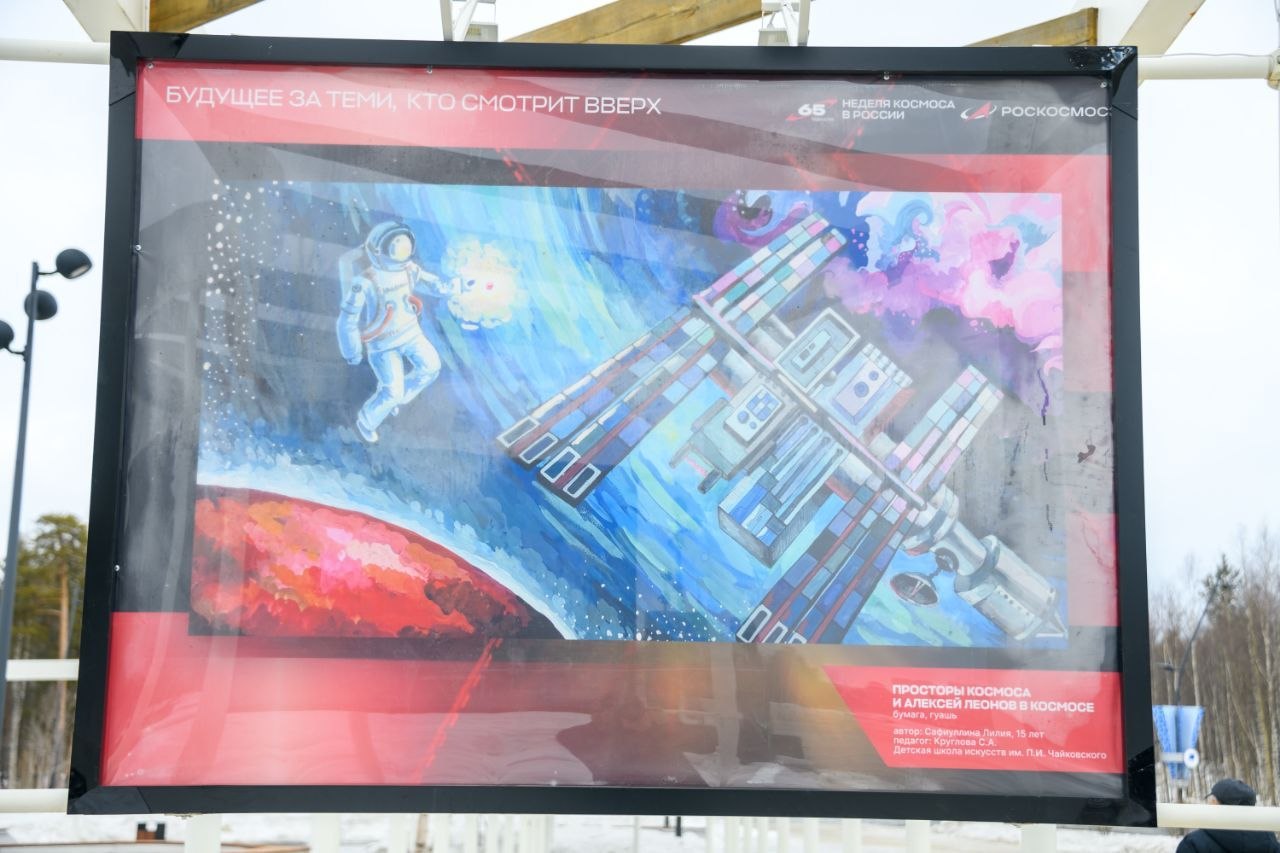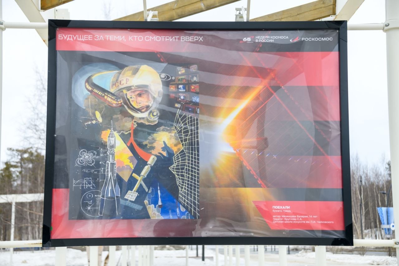 На одной стороне размещена просветительская экспозиция, где можно найти много интересных фактов о покорении космоса, а на второй — представлена выставка творческих работ учащихся Детской школы искусств им. П. И. Чайковского. Наши юные художники поделились своим видением космических просторов — их фантазия и талант не оставят никого равнодушным!