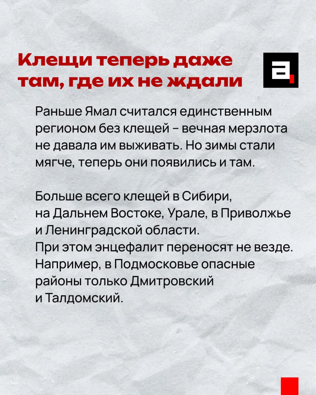 Клещи проснулись раньше обычного и добрались даже до Ямала, который еще недавно считался единственным регионом России без них. Больше всего паразитов сейчас в Сибири, на Дальнем Востоке, Урале, в Поволжье, Карелии и Ленинградской области.