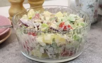 Такой картофельный салат с курицей и овощами — это не только вкусный, но и лёгкий ужин, который согревает душу в холодные дни. В нем есть всё необходимое: углеводы, белок и клетчатка. Попробуйте и насладитесь!