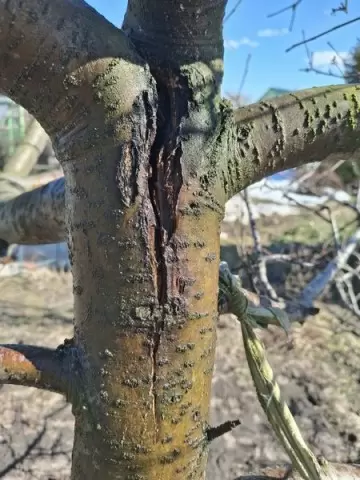 Неприятность произошла и у ряда садоводов, когда молодая яблоня расщепилась. Такая ситуация может быть вызвана скрытыми трещинами, которые усугубились под весом снега.