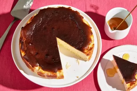 После выпекания дайте чизкейку остыть при комнатной температуре, не накрывая его. Затем перенесите в холодильник на ночь. За это время он преобразится, обретая идеальную кремовую текстуру и контраст между темной корочкой и сладкой серединкой — именно за это десерт полюбился многим.