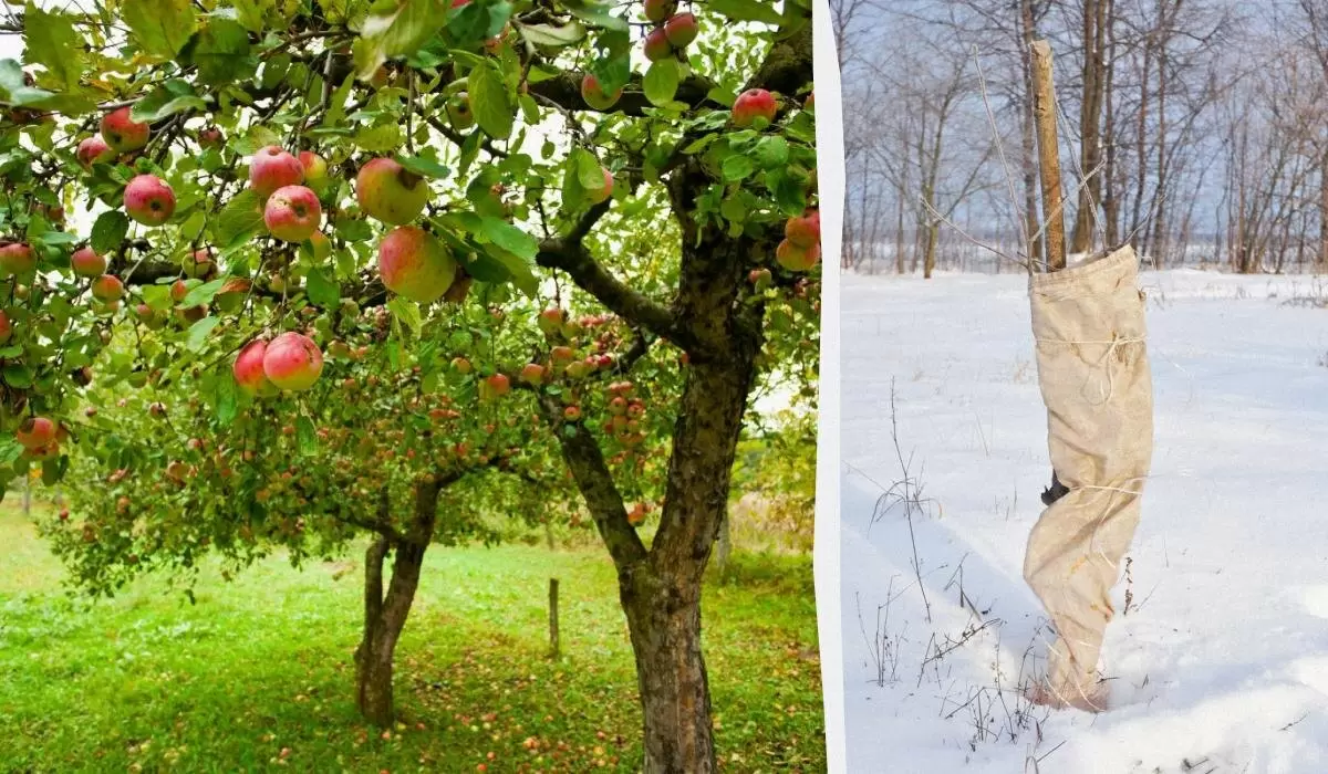 Для самой яблони важно обеспечить защиту прикорневой шейки — самой нижней части ствола. Ее следует обмотать несколькими слоями теплого материала, а сверху защитить мягким металлом или мелкой сеткой для предотвращения повреждений от мышей и других грызунов.