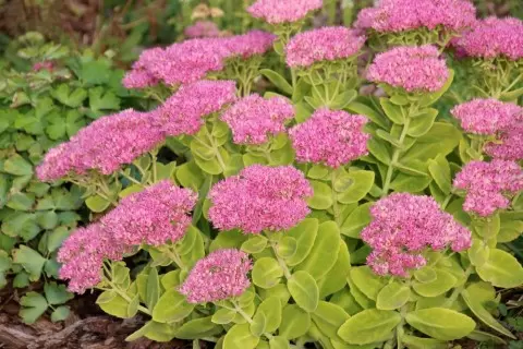 - Herbstfreude — высота до 60 см, соцветия сначала нежно-розовые, затем оранжево-коричневые. Прекрасно растёт на солнечном месте.