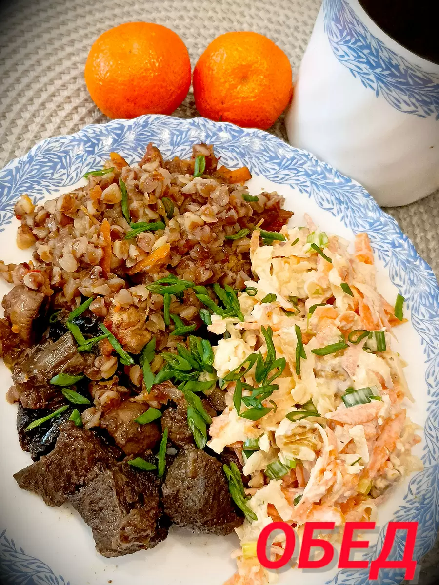 Сегодня на обед представлена порция домашней уюта, разнообразная и сытная. Меню включает в себя гречку по купечески с грибами, тушеное мясо дикого гуся, украшенное черносливом и грибами, а также свежий салат из моркови и дайкона с зелёным луком, заправленный нежной смесью майонеза и греческого йогурта. И, конечно же, не обойтись без чашки ароматного чая с бергамотом и нескольких сочных клементинок для настроения!