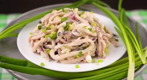 Отжмите маринованный лук от лишней жидкости и соедините его с нарезанными яйцами и кальмарами. Приправьте солью, перцем и добавьте майонез по вкусу. Аккуратно перемешайте все ингредиенты. Салат можно подавать сразу: он отлично держит форму и не течет, а для более привлекательного вида посыпьте его зелёным луком.
