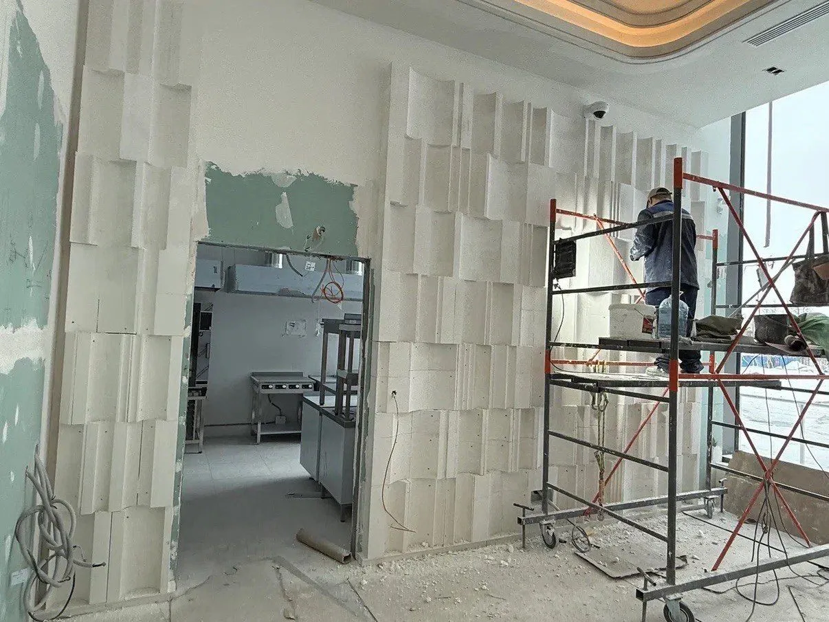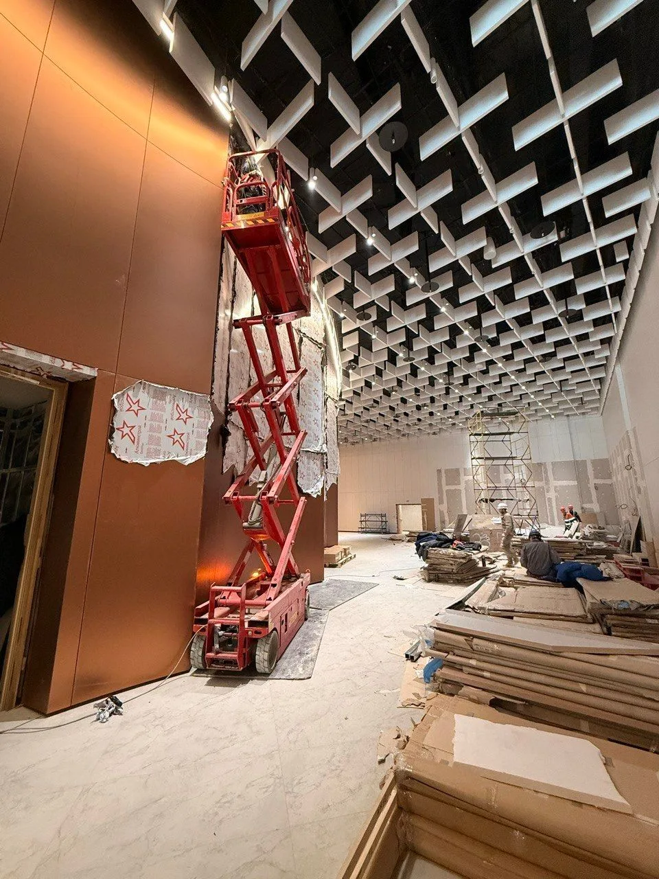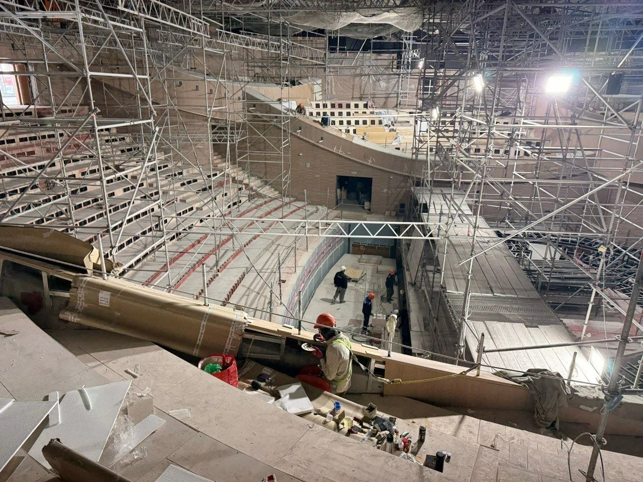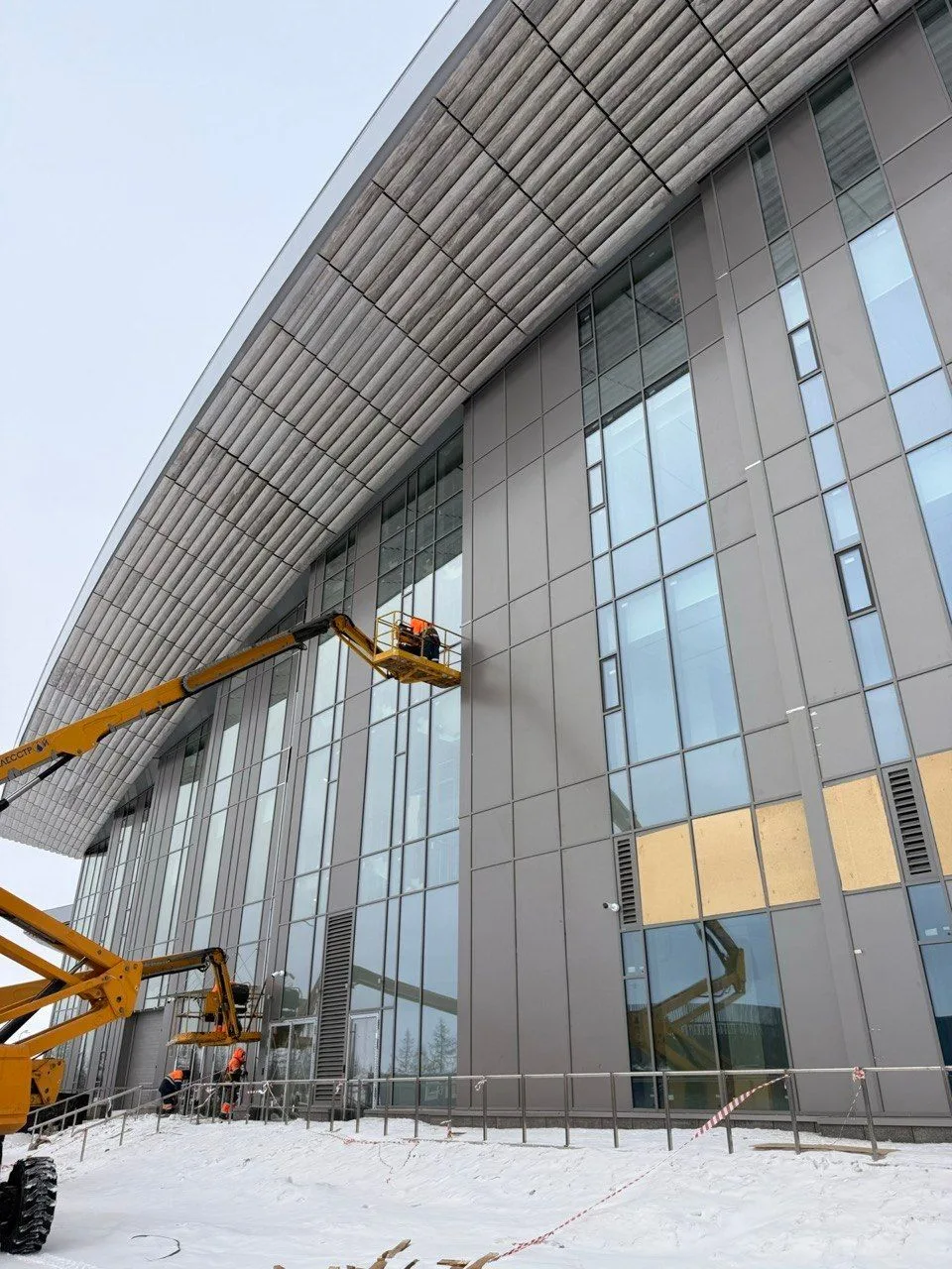 Строительные работы в здании нового культурного центра в Новом Уренгое подходят к финишу. Готов фасад здания. Полностью завершенное просторное и светлое фойе. Его уже можно увидеть вечером из панорамных окон. Финишная отделка производится в помещениях детского центра, ресторана и гостиницы. В уникальном актовом зале одновременно производят крепление декоративных и акустических шпон-панелей, покраску потолков и проверку работы каркаса подъемной сцены. Строители готовят помещение к поставке мультимедийного и светового оборудования, которое уже заказано.