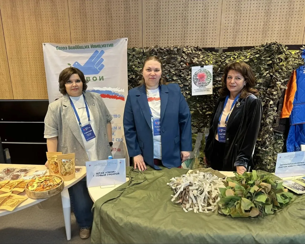 Руководитель штаба «Свои» Ирина Тикшаева и волонтёры добровольческих организаций «Паучки Нового Уренгоя» и «Полевая кухня-89» презентовали маскировочные сети, нашлемники, плащ-палатки, негасимые спички, сублимированную продукцию.
