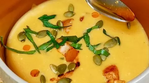 Для подачи обжарьте нарезанную грудинку с добавлением молотой паприки. Разлейте суп по тарелкам, сверху выкладывайте обжаренную грудинку, украсьте семечками тыквы и свежей зеленью. Этот суп станет настоящей звездой вашего стола и подарит всем участникам не только насыщенность, но и удовольствие от необычного вкуса!
