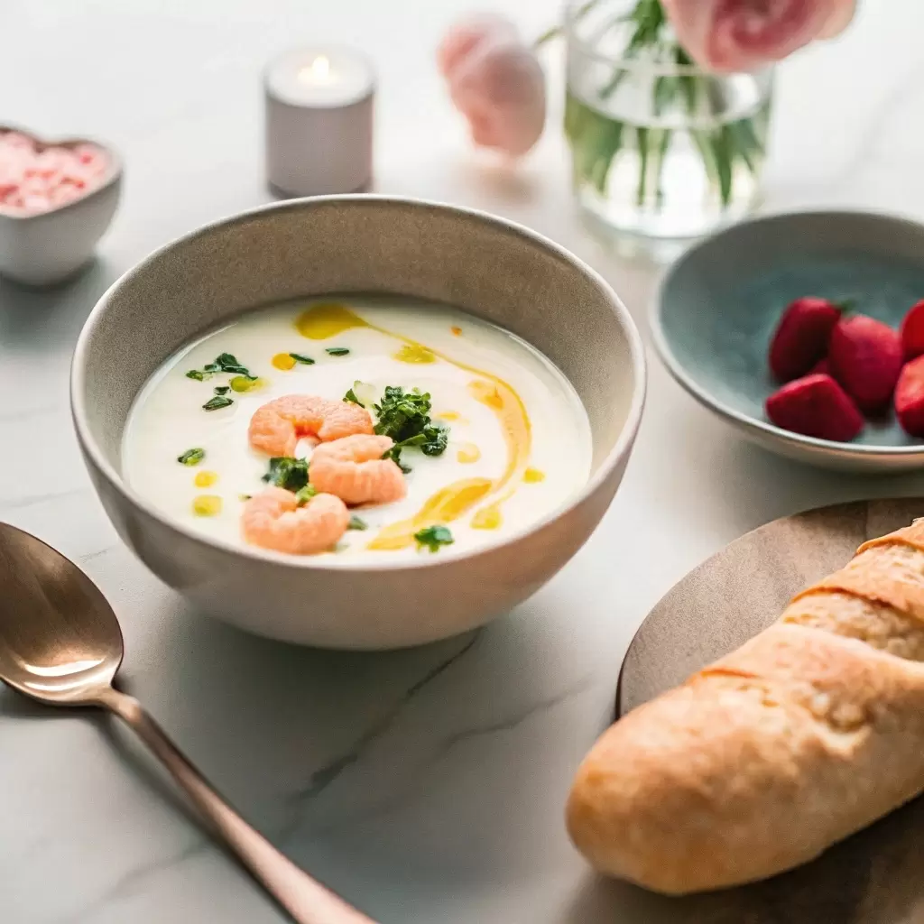 - Сырный суп с креветками и трюфельным маслом: Легкая текстура и насыщенный вкус этого блюда подарят настоящую звезду вечера. Сочетание морепродуктов и сливок создаст невероятную симфонию вкусов.