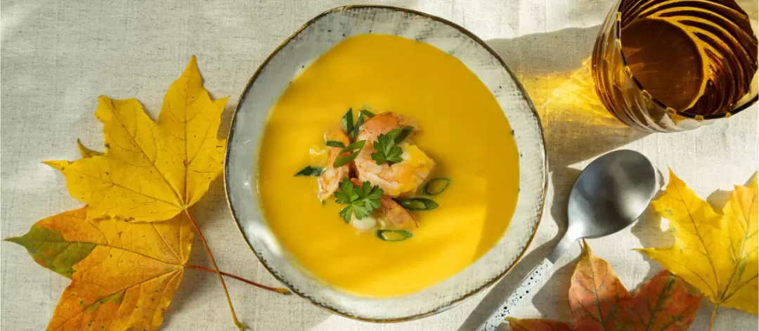 Разнообразьте свой осенний рацион тыквенным супом, в котором переплетаются восточные ароматы и экзотические ингредиенты. Этот кремовый суп с кокосовым молоком и креветками несомненно станет звездой вашего стола. Он не только согревает, но и радует своим вкусом.