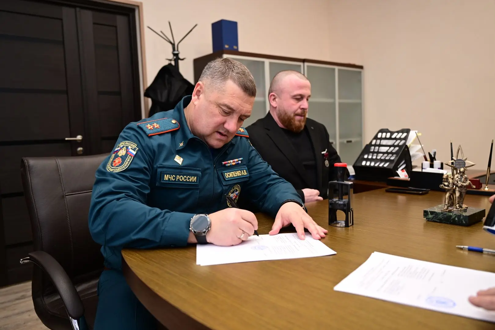 Заместитель председателя региональной ассоциации ветеранов СВО Максим Горшковский и начальник Управления договорных подразделений федеральной противопожарной службы ГПС № 3 Александр Осипенко подписали соглашение о взаимодействии, которое будет действовать на бессрочной основе.