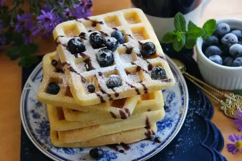 После приготовления дайте вафлям немного остыть — именно в этот момент они станет по-настоящему хрустящими. Ожидайте выхода 5-6 штук, которые идеально подойдут для подачи с любимыми ягодами, фруктами или шоколадом. Приятного аппетита!