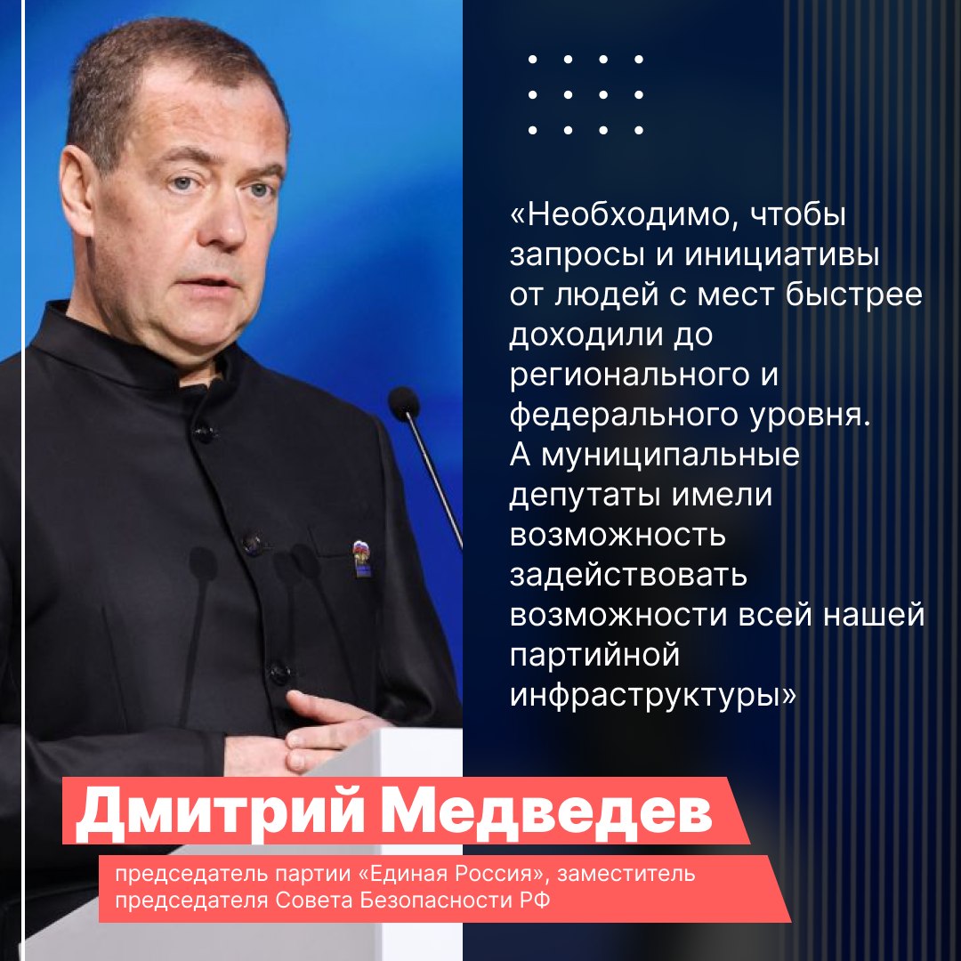 Дмитрий Медведев выступил на форуме «Малая Родина – Сила России». Председатель партии «Единая Россия» напомнил, что прошедший год был объявлен Годом муниципального депутата. Он отметил необходимость усиления внутрипартийной коммуникации. Также Медведев поручил создать правовую основу для защиты добросовестных муниципальных служащих, которые приносят пользу регионам.