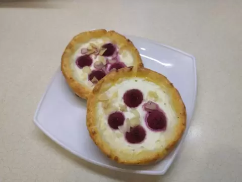4. Заполните ватрушки творожной начинкой и вдавите в нее ягоды. При желании можно посыпать сверху миндальными лепестками для дополнительного аромата и текстуры. Выпекайте вкусные ватрушки в предварительно разогретой до 180°C духовке в течение 30-35 минут.