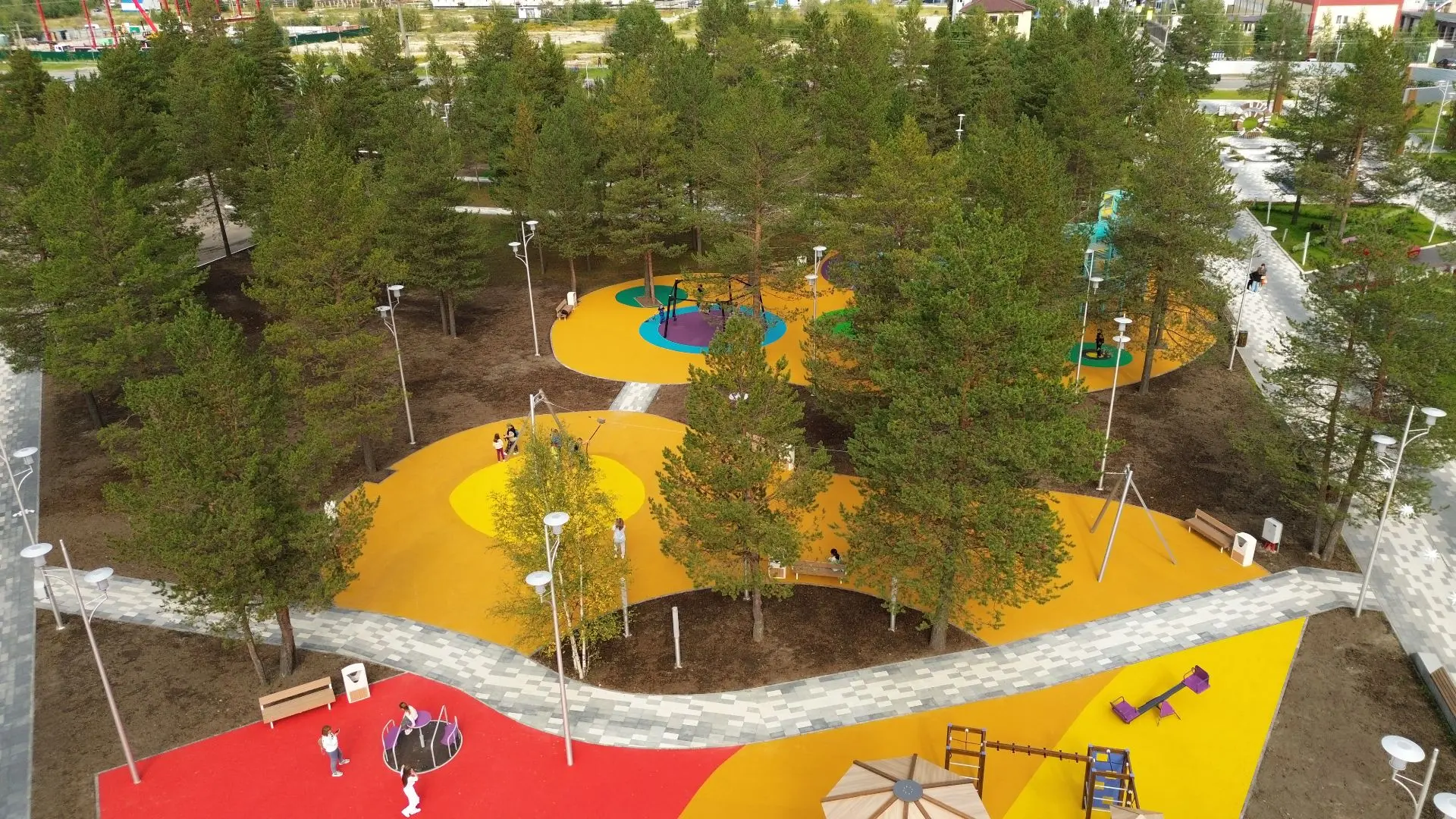 Благоустройство проходило в несколько этапов. В 2024 году в парке появились четыре современные детские площадки, каждая из которых ориентирована на свою возрастную группу.