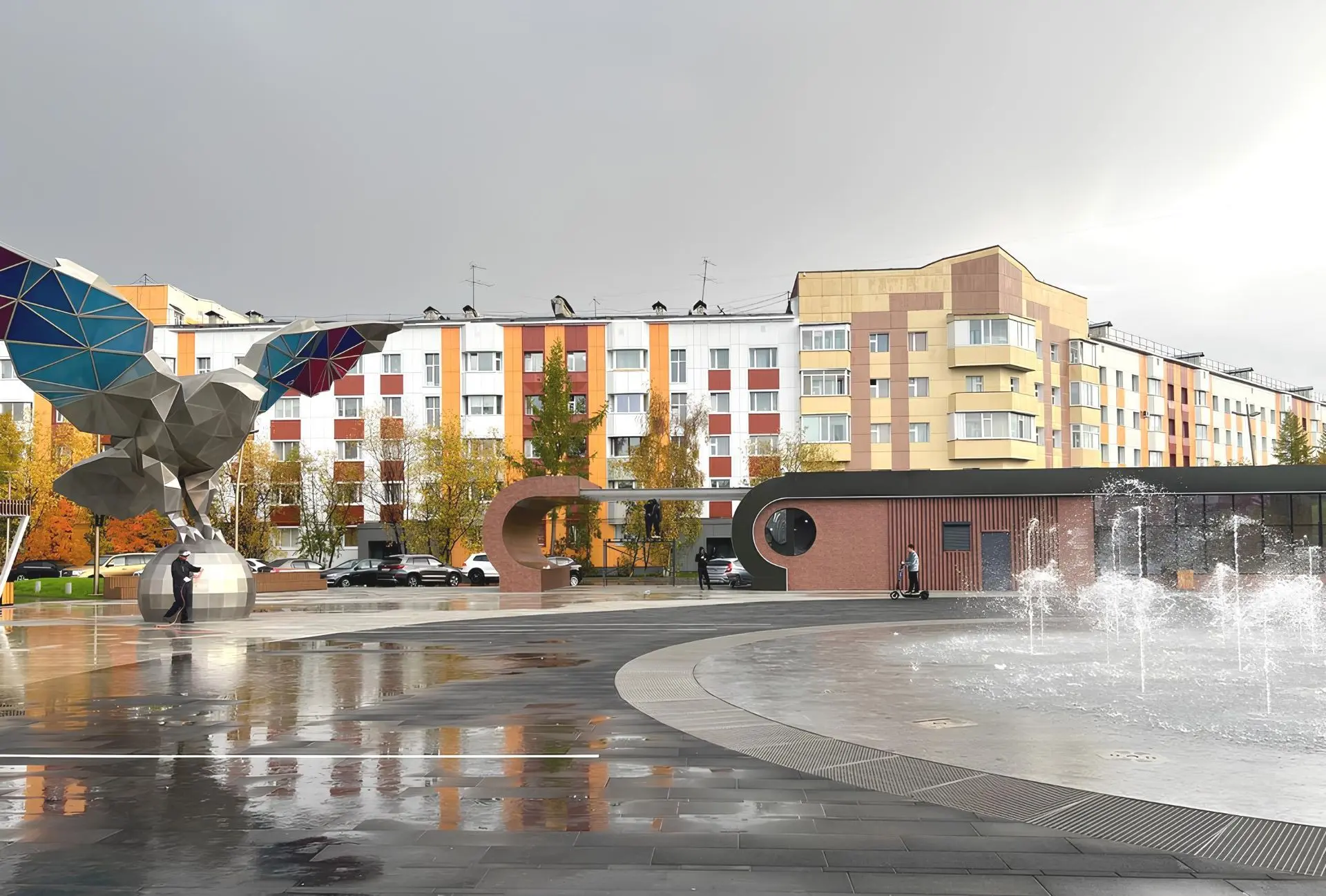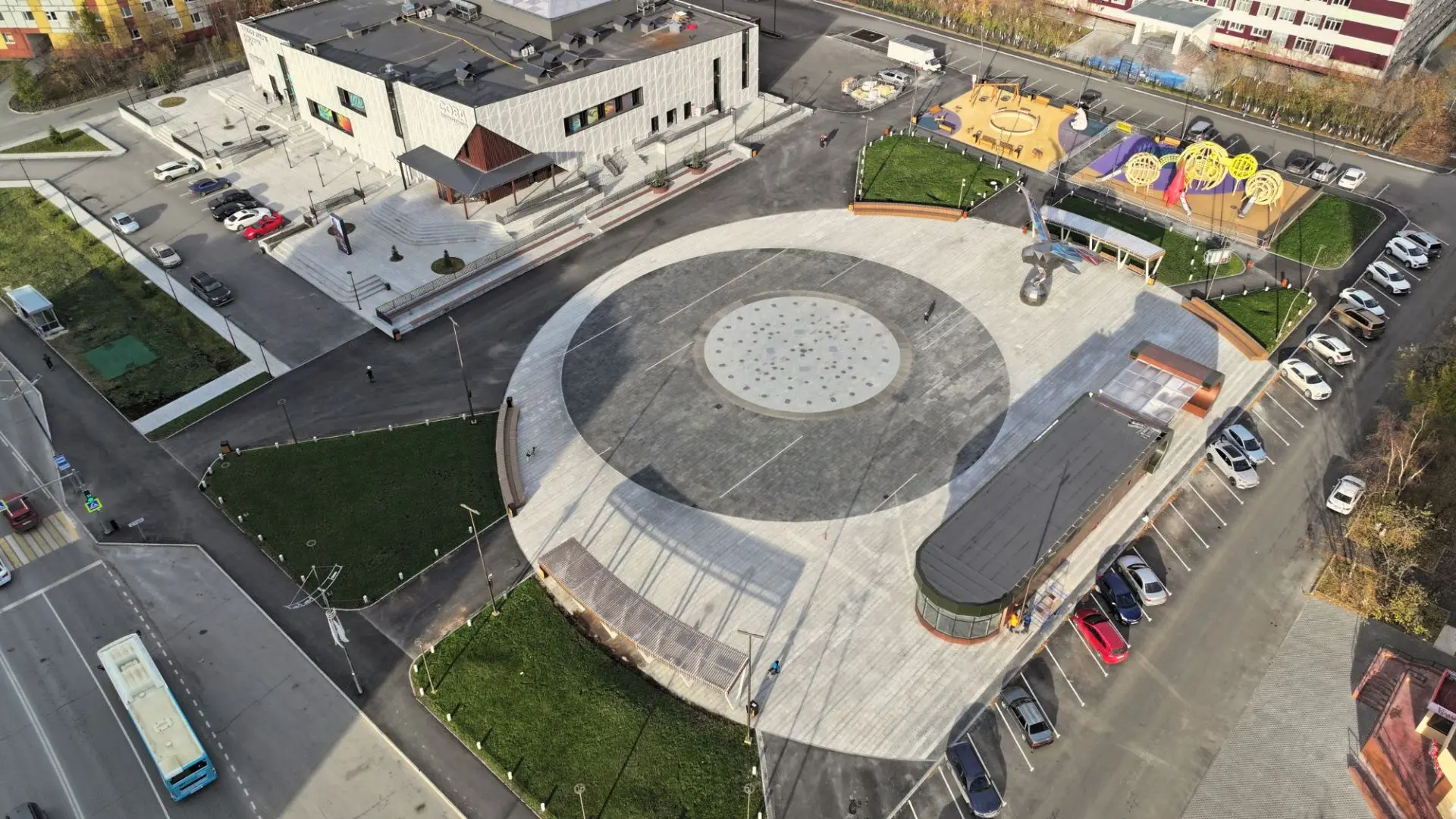 Пространство обновили к 50-летнему юбилею города.Там появился первый светомузыкальный фонтан, который зимой превращается в каток. Также на площади установили арт-объект «Полярная сова», обустроили парковку на 200 машино-мест, амфитеатр и кафе.