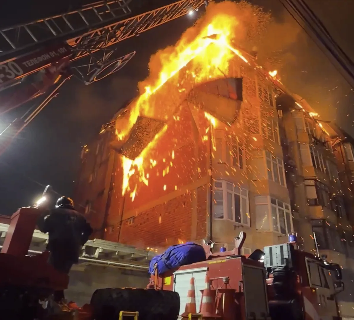 Часть кровли горящего многоквартирного дома обрушилась в Махачкале. Эвакуировано 75 человек, в том числе 24 ребёнка. По предварительным данным, никто не пострадал.