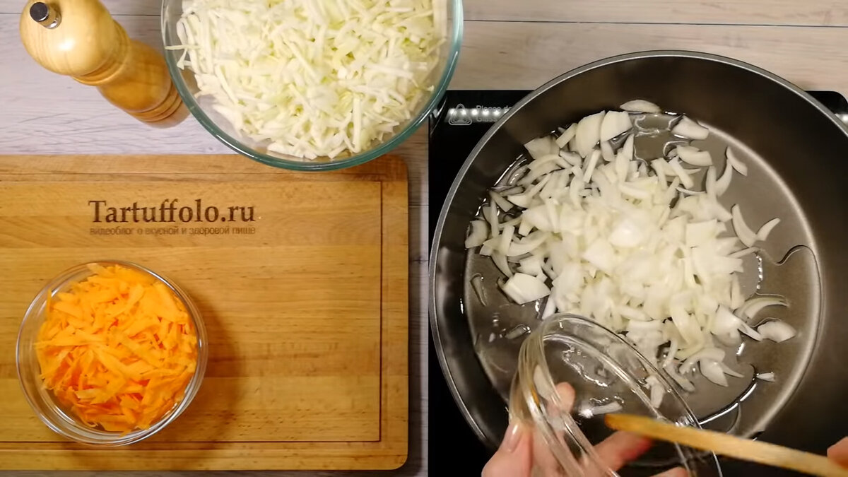 Затем в сковороду добавляется нашинкованная капуста. На среднем огне овощи необходимо готовить до полной мягкости, не забывая перемешивать. По вкусу необходимо посолить и поперчить блюдо. Для дополнительного аромата можно добавить немного тмина и тщательно перемешать начинку, оставив ее на огне еще на пару минут.