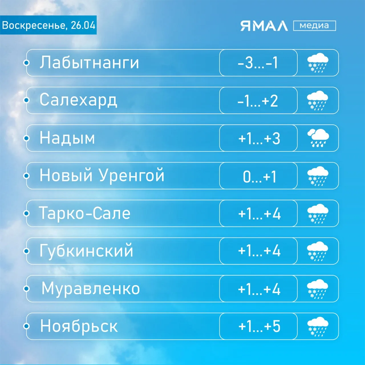 В воскресенье на Ямале будет пасмурно и сыро: местами пройдёт снегодождь, а лёгкий весенний ветер попробует унести остатки настроения — держимся.