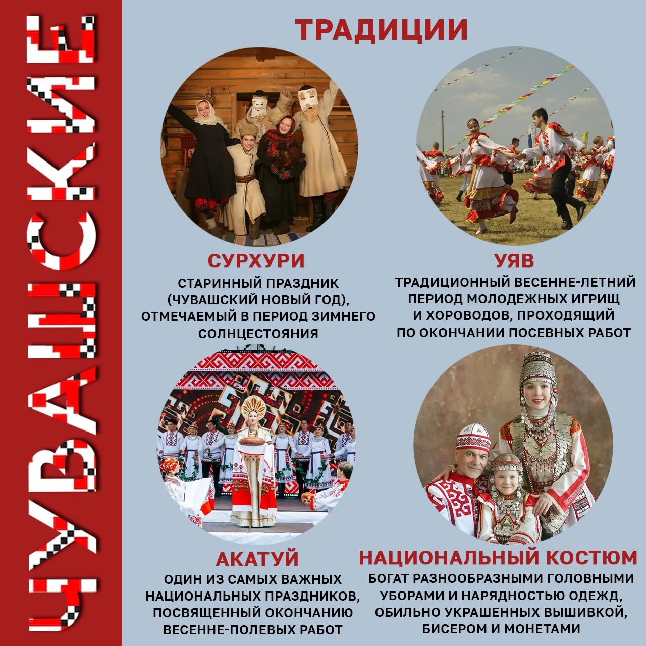 Чуваши — пятая по численности нация России, большая часть представителей которой владеет чувашским языком — единственным живым из исчезнувшей булгарской группы. Чуваши известны своими песнями, которые часто сопровождаются игрой на традиционных инструментах, таких как гусли и барабан. Одна из важных традиций — уважение к природе. Чуваши считают, что земля, вода и лес имеют своих духов, которых нужно почитать. Это отражается в их обрядах и праздниках, приуроченных к сезонным изменениям в природе и аграрным циклам. Например, Акатуй — праздник начала и окончания весенних полевых работ. В эти дни устраивают народные гуляния, соревнования, песни и танцы.