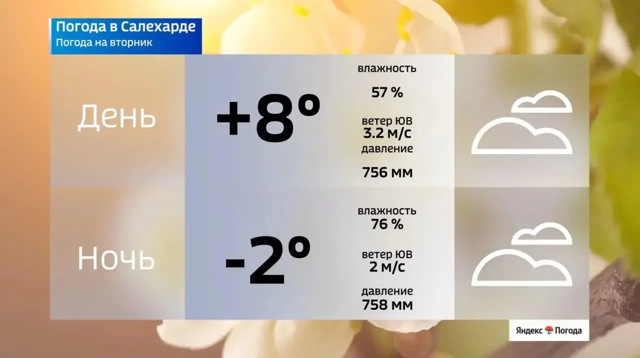 В окружной столице днём +8°C, ночью 2°C, ветер юго-восточный 2-3 м/с.