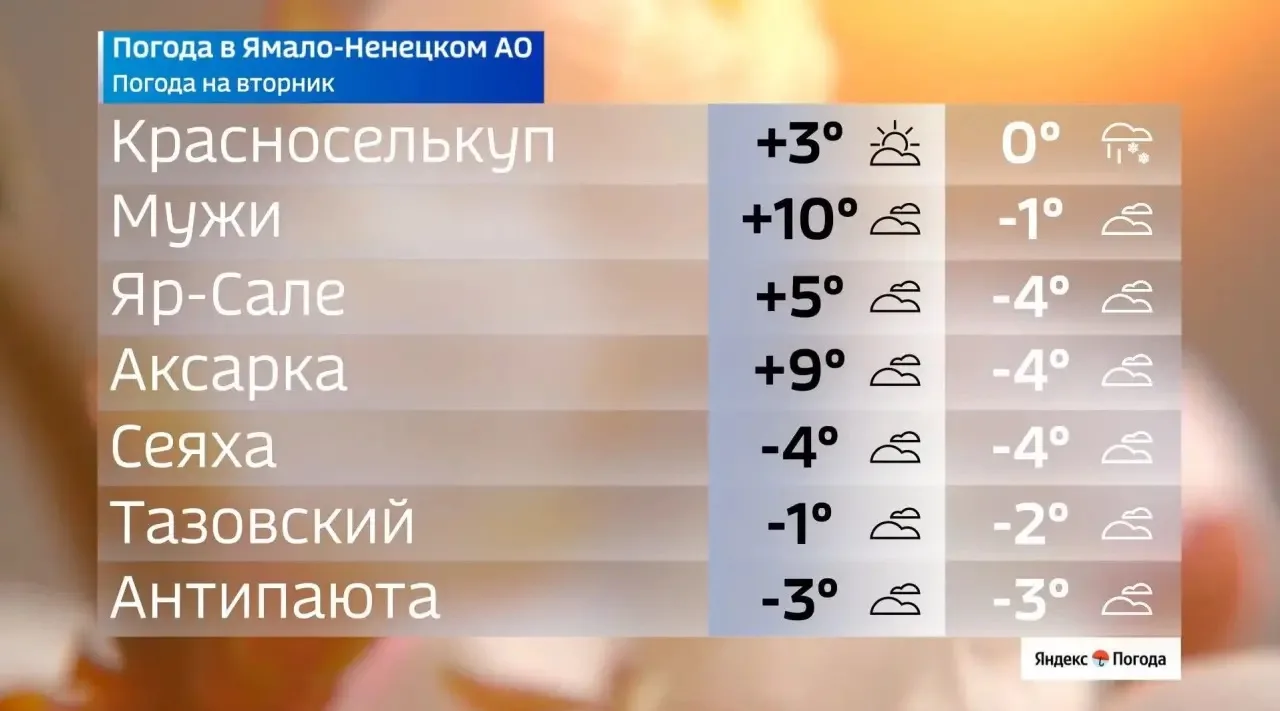 Теплее всего в Ноябрьске, Муравленко и Губкинском: до +10°C. На севере округа прохладно: в Сеяхе 4°C, в Антипаюте 3°C.