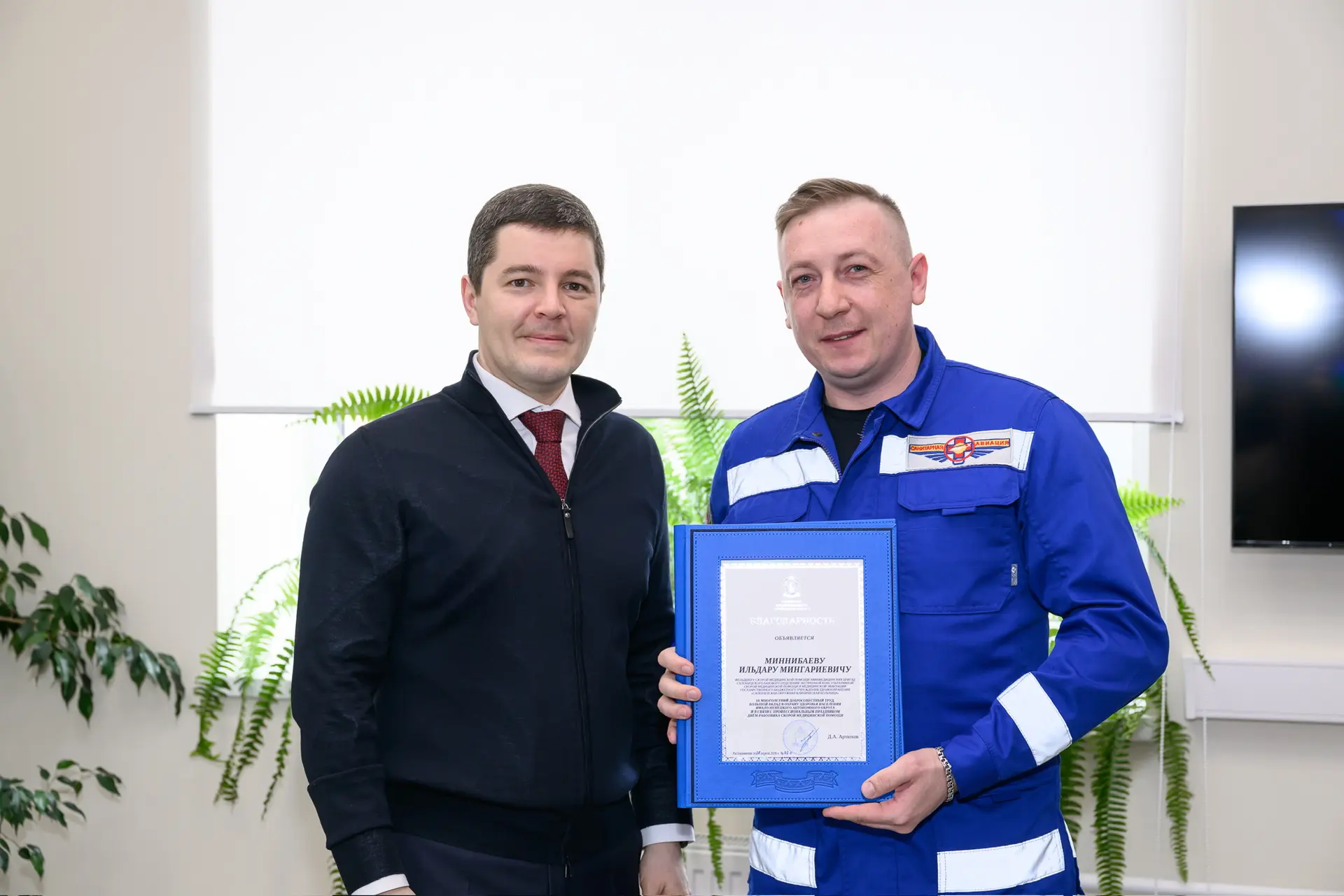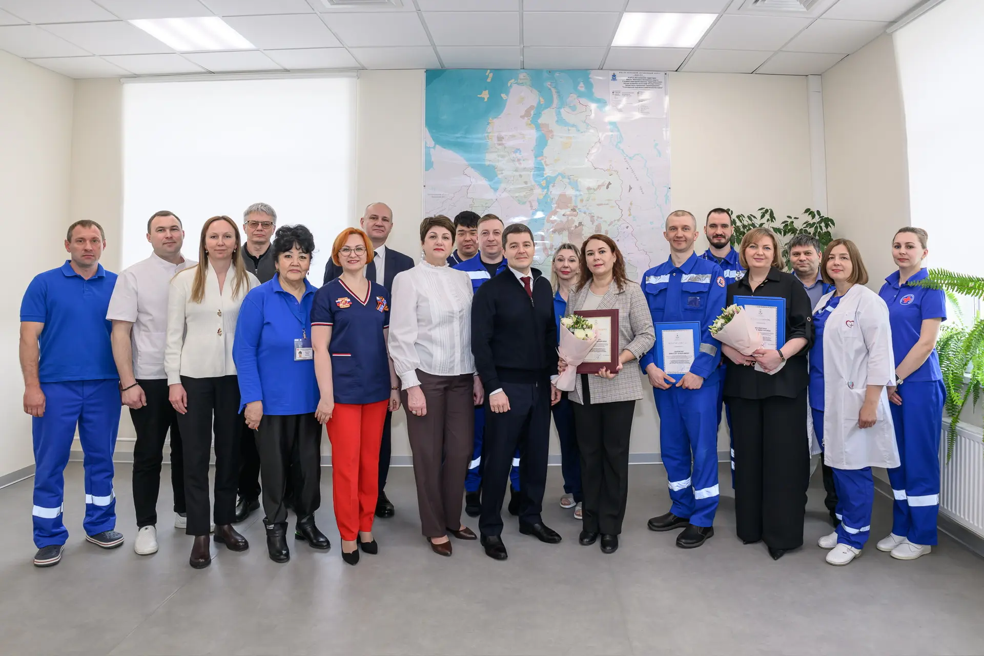 В профессиональный праздник встретился с работниками скорой помощи в центре медицины катастроф в Салехарде, вручил награды, обсудили волнующие вопросы.