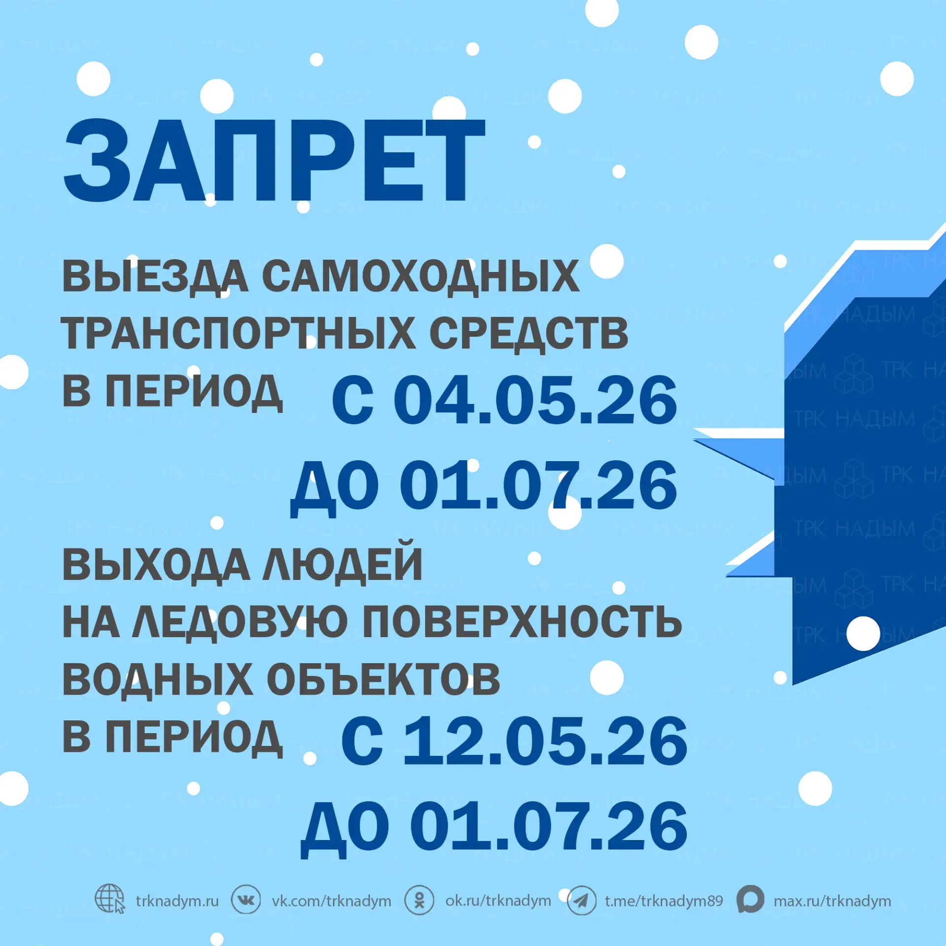 В связи с началом весенней распутицы на территории Надымского района установлен запрет выезда на ледовую поверхность водных объектов самоходных транспортных средств с 04 мая до 01 июля, запрет выхода людей на ледовую поверхность водных объектов с 12 мая до 01 июля.