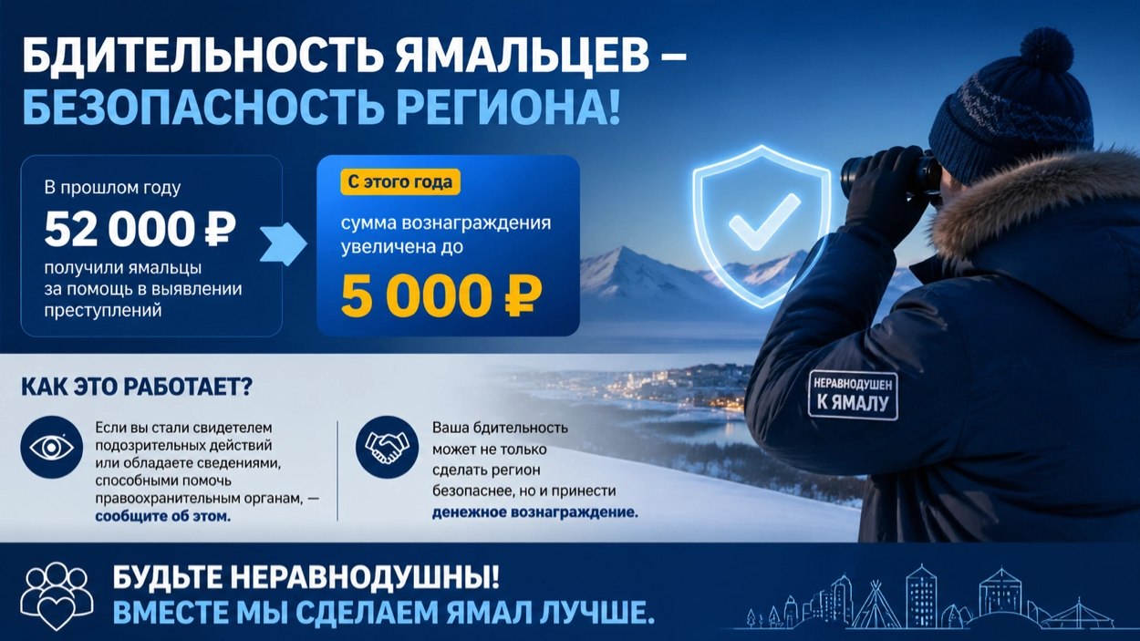 Подробнее о порядке выплаты денежного вознаграждения можно ознакомиться на сайте департамента региональной безопасности ЯНАО: https://clck.ru/3TML89
