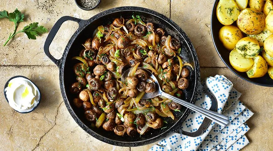 - Жареные грибы с луком и сметаной: Сначала грибы очищают и нарезают, а затем обжаривают с луком на растительном или сливочном масле. После того как грибы выпустят жидкость, добавляют сметану, соль, перец и зелень. Это блюдо идеально подходит к картофелю или свежему хлебу.